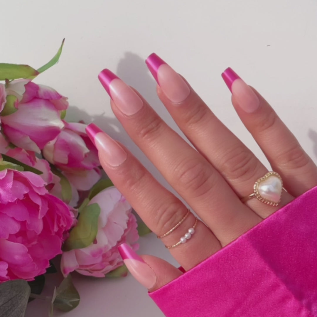 Pink Chrome French Tip Press-On Nails! Need we say more? We took the chrome nail trend to the next level with this pretty pink Instant Mani. Features a hot pink chrome French tip and a natural nude nail base. The medium length is salon sculpted and ultra durable.