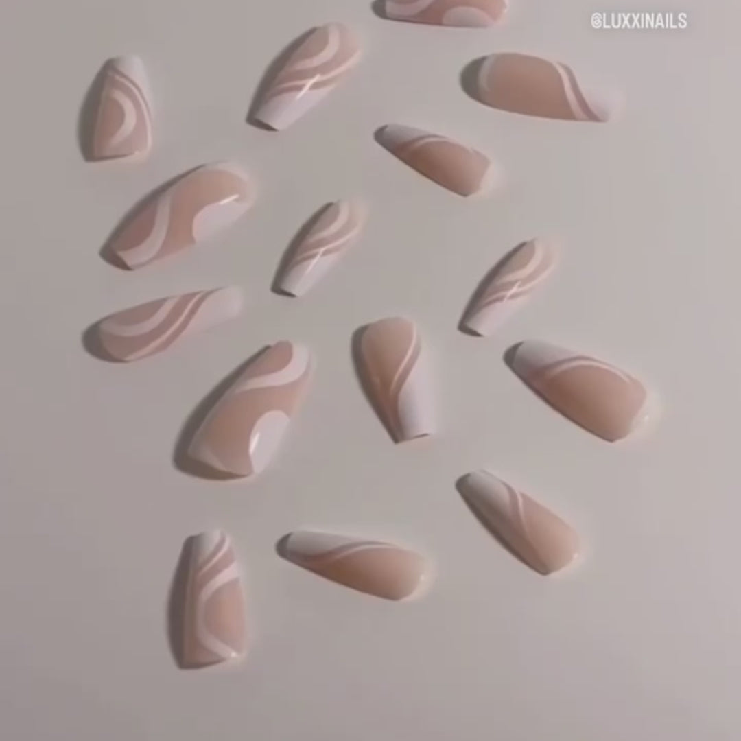 These modern abstract press-on nails will have you feeling like a star! White abstract swirls are featured on each perfectly sculpted coffin nail tip and the nude base gives the illusion of natural nails. The medium length can easily be trimmed down to a shorter length.